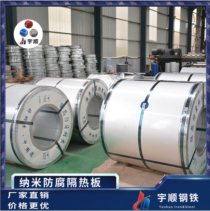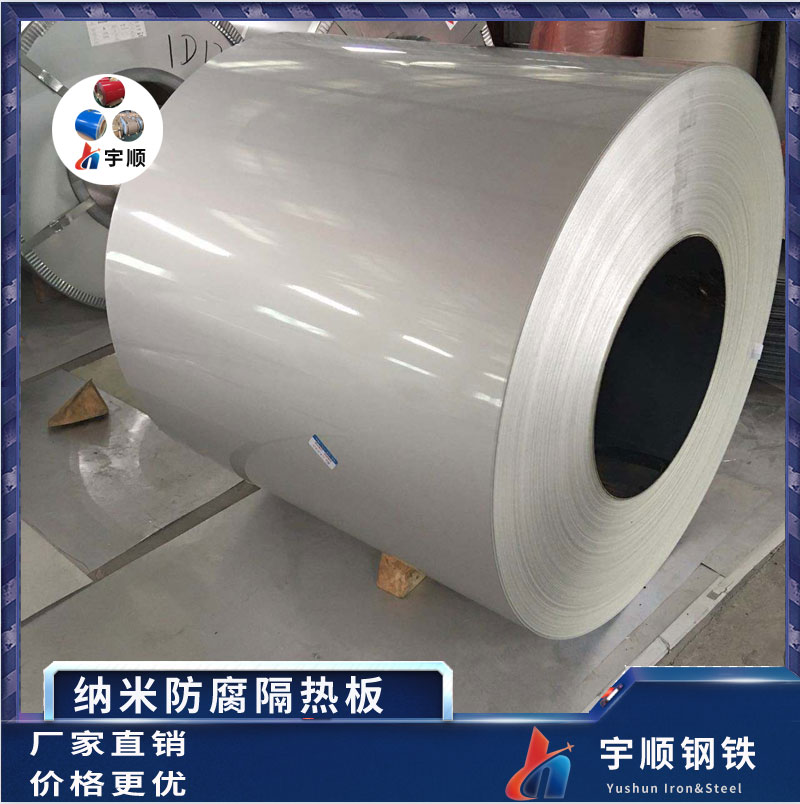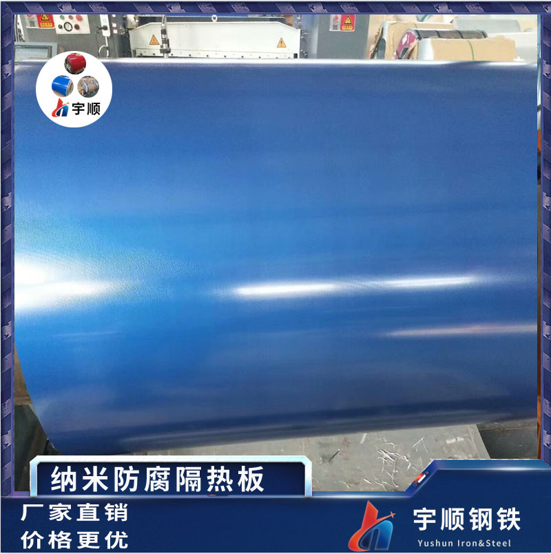 產品簡介 防腐隔熱鍍鋁鋅板是集熱反射隔熱、耐老化、防腐、耐酸堿為一體的金屬屋面材料。本產品在鍍鋁鋅板外表面粘覆的鋁箔層,能將太陽光和紅外線熱能反射出金屬板表面,在可見光波長0.38—0.765m范圍內,其反射率可達70%—80%,在紅外線光波長0.76—505m范圍內,反射率可達75%—100%,其隔熱效率高,夏天日照時彩鋼板表面也不燙手。同時耐老化膠將表層納米抗老化隔熱膜與鍍鋁鋅板牢牢