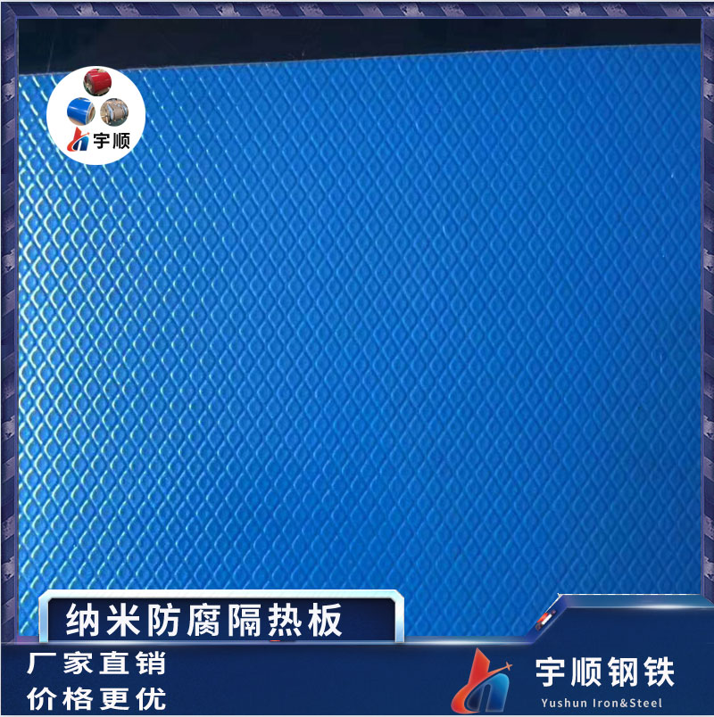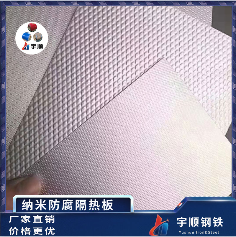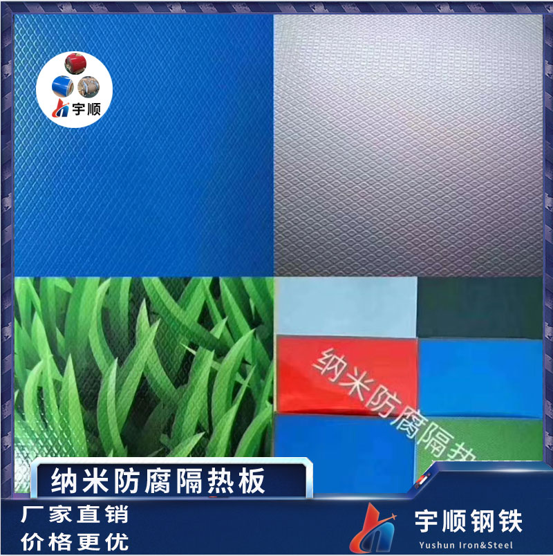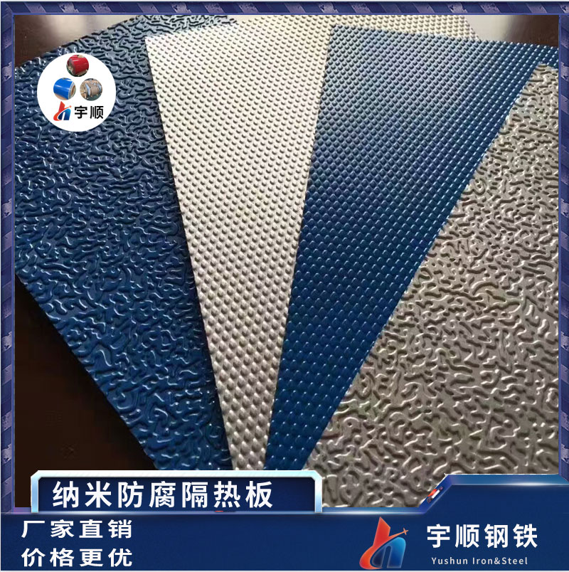 防腐隔熱鍍鋁鋅板,它以鍍鋅板或冷軋鋁板為基板,在基板的外表面依次粘履有鋁箔層、耐老化PET層,表面壓有壓多種花紋,采用耐老化膠合劑粘接,使各層粘接更為牢固,即使在極低溫的寒帶也不易剝落分層。該產品由于吸光率低而隔熱效果顯著,同時隔音、防火、防腐蝕、抗老化,其結構簡單,薄而重量輕,易于運輸、拆裝,使用壽命長,該產品不反光、無光污染,達到節能和環保統一。